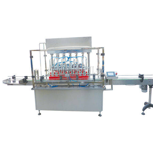 本機是消毒劑、帶酸性、堿性藥液生產(chǎn)線中的灌裝、封口、貼標主機,主要用于對100ml以上玻璃瓶或塑料瓶進行灌裝、封口、貼標。采用直線輸送,根據(jù)產(chǎn)量6-12泵直線灌裝,采用PLC控制裝量,裝量大小在觸摸屏上自行調(diào)節(jié)。灌裝定位方式采用電腦計數(shù),氣缸定位。料桶液位高低采用電子感應(yīng),自動控制,保證自流壓力、確保灌裝精度。整機與料液接觸部份全部采用耐酸板及聚脂四氟乙稀組成。本機設(shè)計先進,結(jié)構(gòu)緊湊。